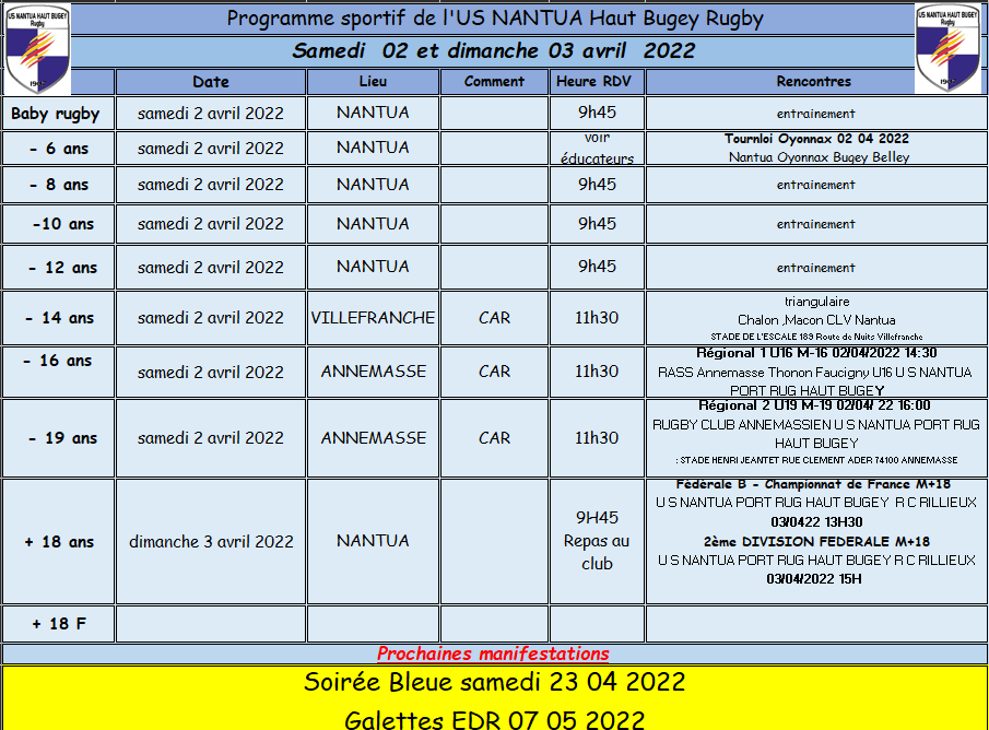 Programme sportif : 2-3 AVRIL 2022