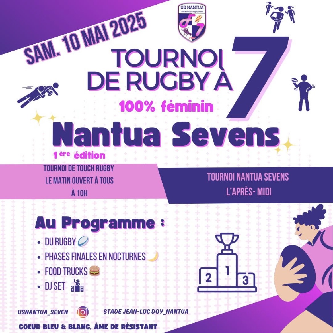 Le Nantua Seven, tournoi de rugby à 7 100% féminin, se déroulera le 10 mai 2025 au stade Jean-Luc Doy à Nantua. Une journée placée sous le signe du sport, de la convivialité et de la fête avec un DJ set, des démonstrations et des food trucks !