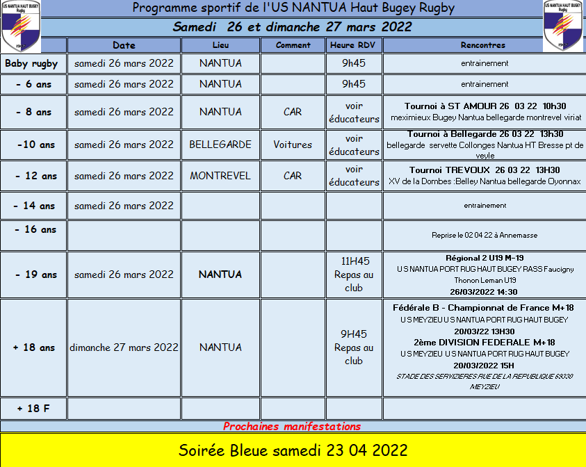 Programme sportif : 26-27 mars 2022