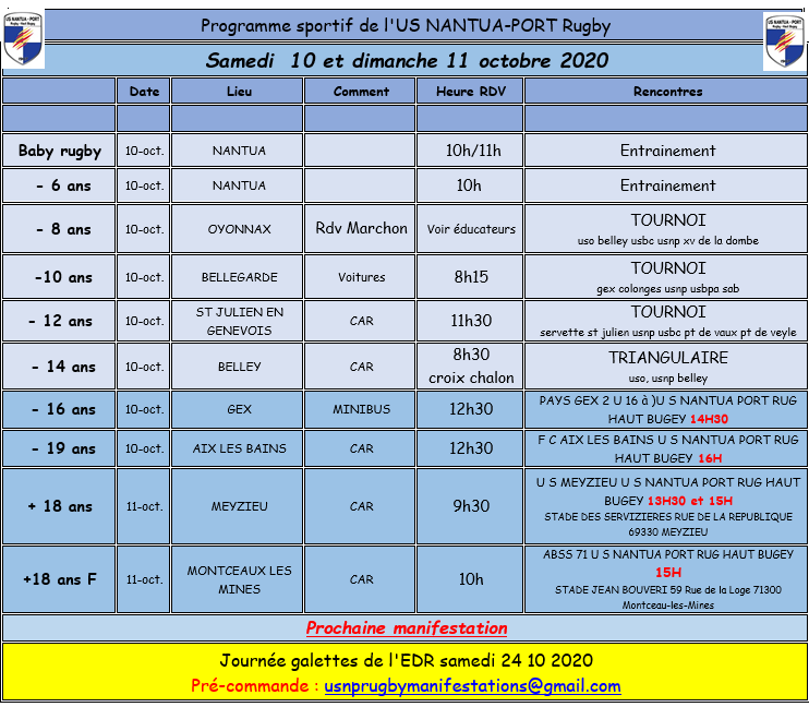 Programme sportif USNP : Samedi 10 et Dimanche 11 octobre 2020