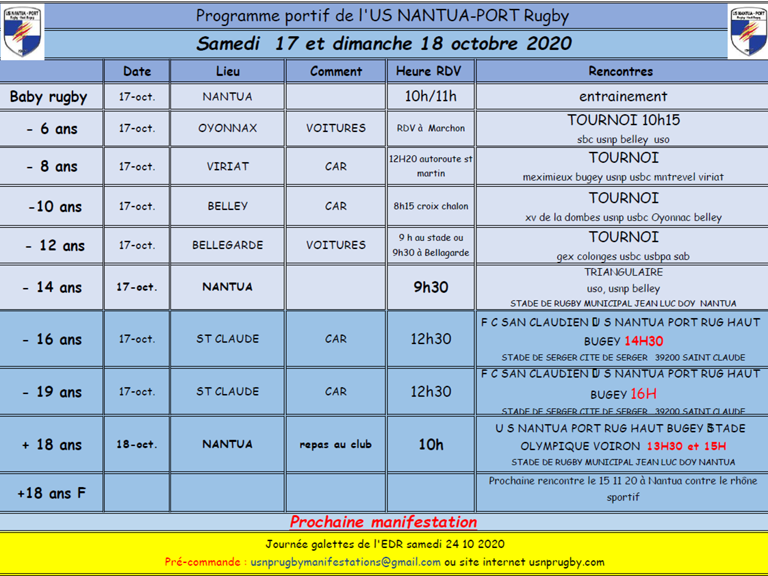 Programme sportif USNP : Samedi 17 et Dimanche 18 octobre 2020